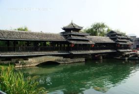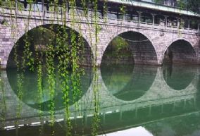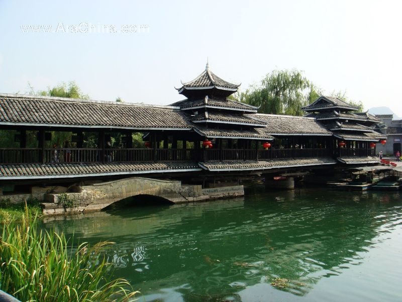 是桂林最古老的桥,始建于宋代嘉熙年间。它位于公园正门,横跨在小东江和灵剑溪汇流处之上,全长135米。桥面有风雨长廊,桥亭覆绿色琉璃瓦,桥身为磐石,具有浓郁的民族风格。每年春夏,花开烂漫,桥畔繁花似锦,桥两岸遍植桃花、翠竹,小桥掩隐于“满溪流水半溪花”之中,花桥因此而得名。现桥是1965年依原式重修的四孔桥,青石所砌。桥下,四个半圆的桥孔与其在水中的倒影形成四个玉盘,状如满月,正如“四轮明月伴芙蓉,半入澄江半化虹”诗句中所颂的 “花桥虹影”之美景。