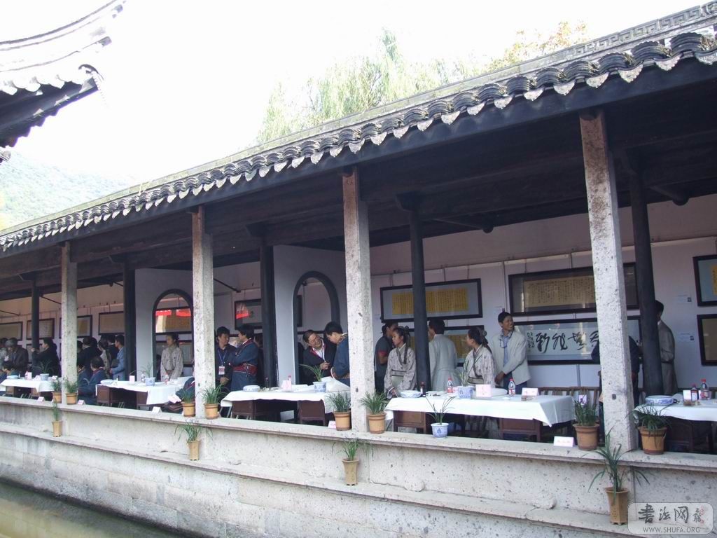 “曲水流觞”是兰亭非常著名的景点。流觞亭前,一条“之”字形的曲水,中间有一块木化石,上面刻着“曲水流觞”4个字。显现了王羲之《兰亭集序》所描绘的景象“此地有崇山峻岭,茂林修竹,又有清流急湍,映带左右,引以为流觞曲水”。它包涵了一段非常著名的典故:东晋永和九年,农历的三月初三,王羲之邀请了共41位名人雅士在兰亭雅集修禊,他们在酒杯里倒上酒让它从曲水上游缓缓漂下来,如果漂到谁面前停住了,谁就要饮酒作诗,作不出的则要罚酒三觥,一觥相当于现在半斤。活动中共有11个人各作诗两首,15个人各作诗1首,16个人因没有作出诗而罚了酒,总共成诗37首,汇集成册称之为《兰亭集》,推荐主人王羲之为之作序,王羲之欣然答应,趁着酒兴,用鼠须笔和蚕茧纸一气呵成《兰亭集序》,后人称为“天下第一行书”。每年很多文人墨客都喜欢来这里仿效王羲之,兰亭雅集,饮酒赋诗。每年书法节都要在此举行曲水流觞的雅集盛会。