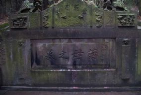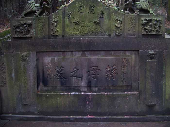 这就是蒋母之基,蒋母亡于1921年6月14日,各位看了可能会说:好普通啊。其实这里却大有来头,此墓以石块砌成,上面扇形拦土石上刻有“壶范足式”四字,含有女中模范、楷模之意。下面墓碑上刻孙中山先生亲题的“蒋母之墓”。两旁对联为“祸及贤慈,当日顽梗悔已晚;傀为逆子,终身沉痛恨靡涯”。拜台刻有风竹图,以示妇女之墓且出身于葛竹村。墓穴朝北就对着蒋介石之父的墓穴(桃坑山)。那为什么蒋介石父母没有合葬在一起呢?蒋母死时,蒋介石身价已高,当时蒋介石在乎叛广东军阀陈炯明,任粤军前敌总指挥。蒋母系其父第三房续配夫人,在其父死后立碑时无法再刻上王氏的姓氏位置。另外在分割遗产时,蒋母同蒋介石的阿哥蒋介卿有矛盾。故在临终前,曾嘱托蒋介,不要把她同葬在其父亲墓穴里,所以蒋介石在其母死时,为他母亲另择基地,而在两墓中都留出了一个空穴。
