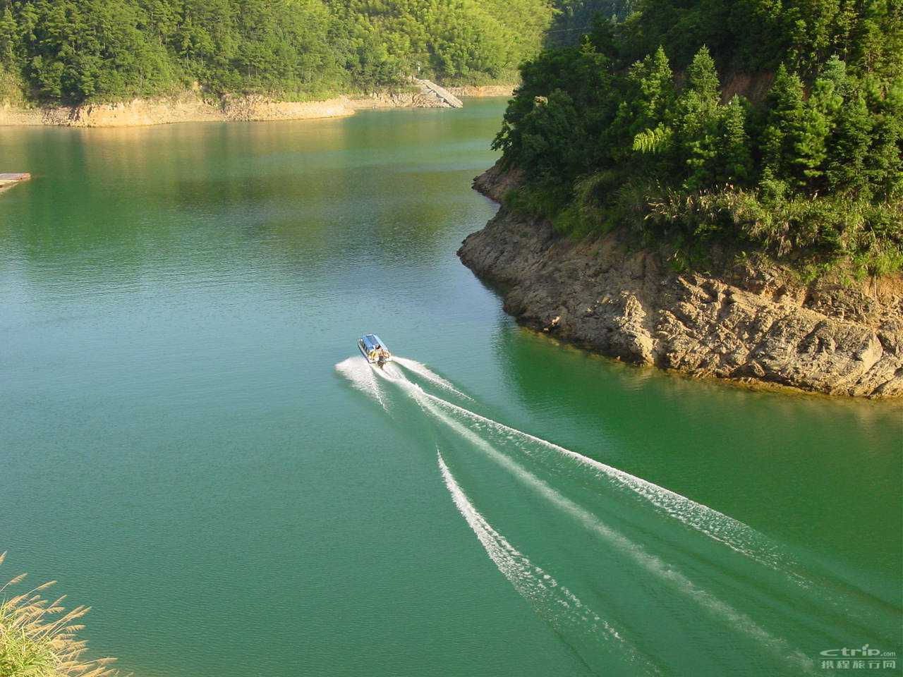 千岛湖湖面开阔,一碧万顷,岛屿棋布;大岛如山,小岛如船,个个清脆欲滴,像一块块半浸在湖中的碧玉。因为水中浮游生物少,湖水才清澈如镜,由于水深,所以看上去就像翡翠般似绿如蓝了。